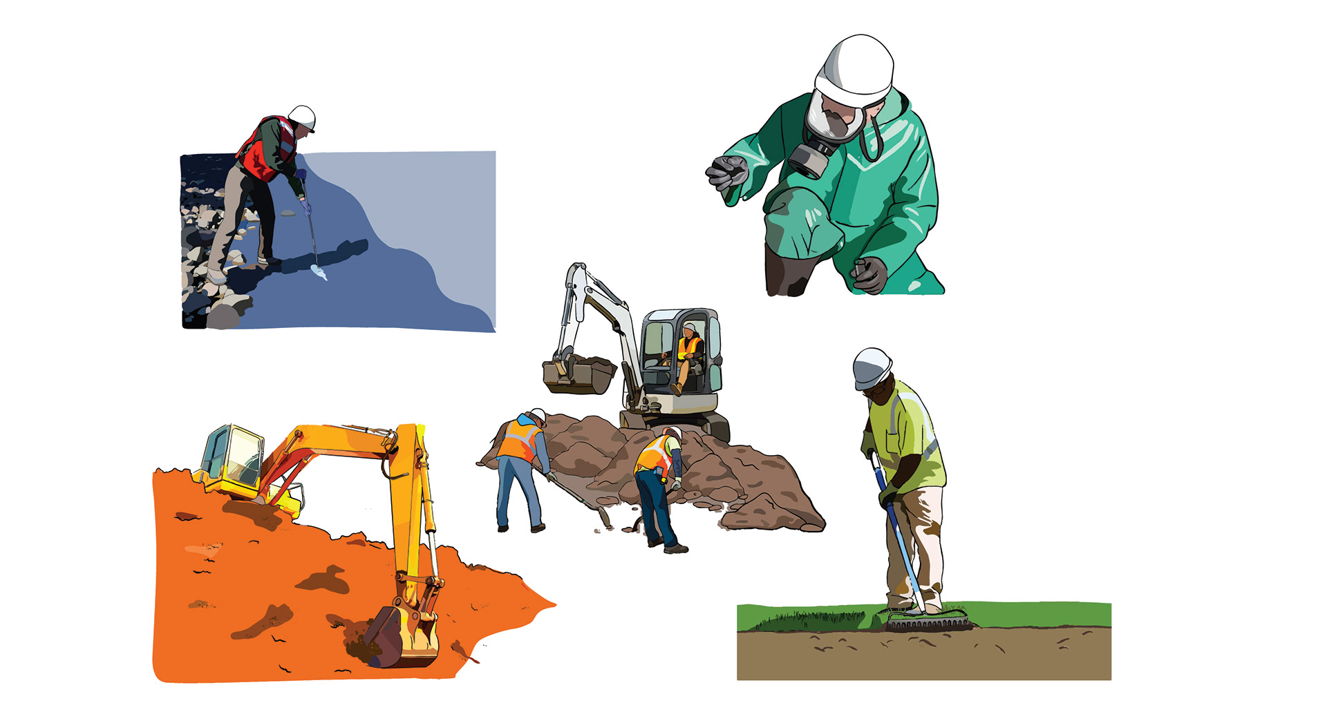 Hand-drawn illustrations for environmental contamination and cleanup-related materials.